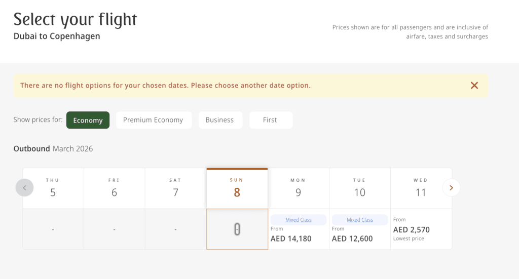 Ifølge flyselskabet er der planlagt dedikerede afgange til København, Oslo og Stockholm, som skal sikre en stabil og kontrolleret genstart af trafikken mellem Dubai og de tre skandinaviske hovedstæder. Selvom de skriver den 8. marts, så kan vi først finde ledige billetter fra mandag den 9. marts. Billetterne er i starten ganske dyre, men falder i løbet af ugen i pris.