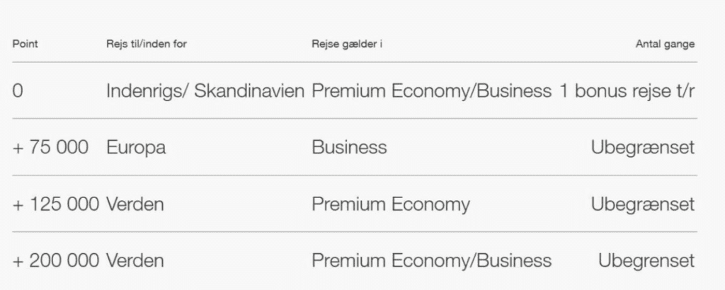 • Niveau 2: Flyvninger i Business indenfor Europa kræver nu 75.000 point mod tidligere 50.000.
