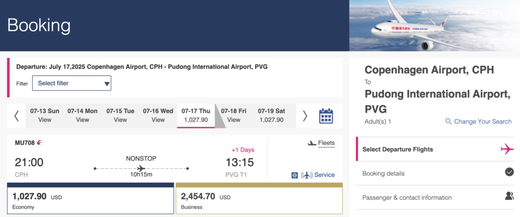 Vi har skrevet om det tidligere og nu er det officielt. China Eastern starter i hvert fald med at sælge billetter til deres nye rute mellem København og Shanghai. En rute der er sat til at have første flyvning den 17. juli 2025.