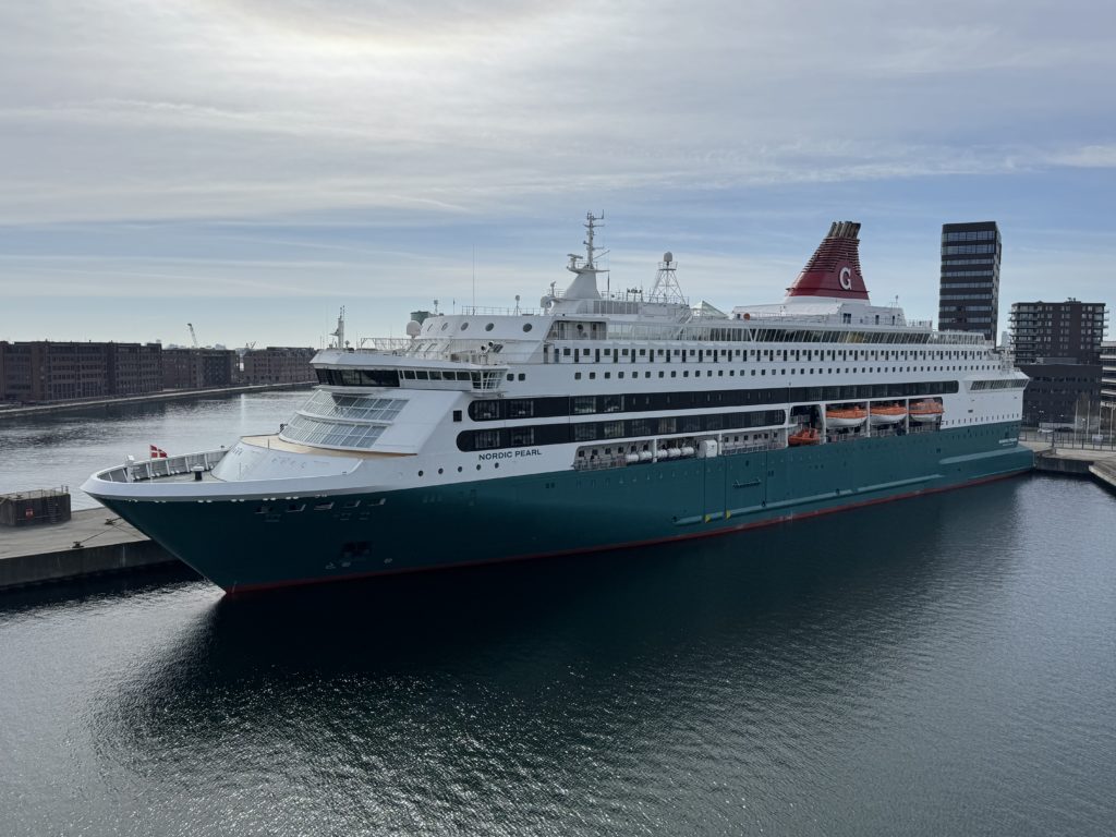Ankomsten til terminalen er effektiv. Nordic Pearl præsenterer sig flot ved kajen med sin karakteristiske mørkegrønne skrogfarve og den røde skorsten med det hvide “G”. Det er tydeligt, at skibet har gennemgået en modernisering, der sigter efter et mere stilrent og skandinavisk udtryk end de klassiske, men efterhånden slidte færger, som DFDS holdt sejlene i nok lidt for mange år. En tur i tørdokken burde have været sket for flere år siden. Det skete så da Go Nordic Cruiseline overtog de to skibe og ruten fra DFDS den 1. november 2024.
