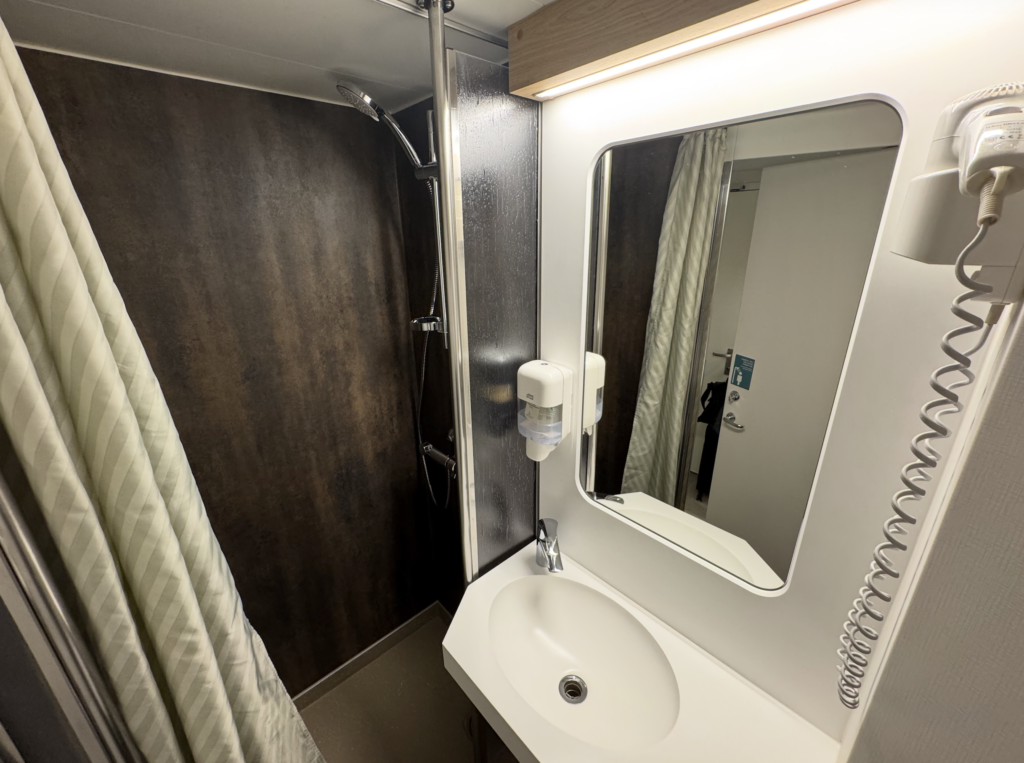 Badeværelset: Her mærker man skibets alder en smule på størrelsen, men Go Nordic har opgraderet finishen. Brusekabinen har moderne armaturer og mørke, strukturerede vægpaneler, der giver en mere “hotel-agtig” følelse end de klassiske hvide plastikmoduler.