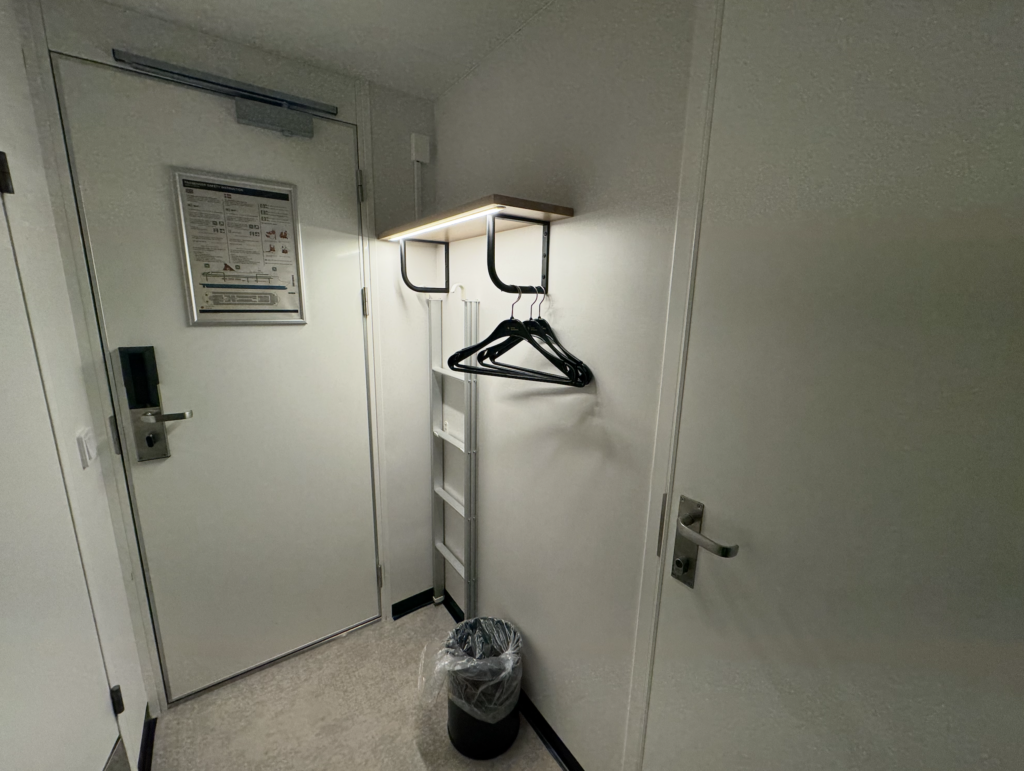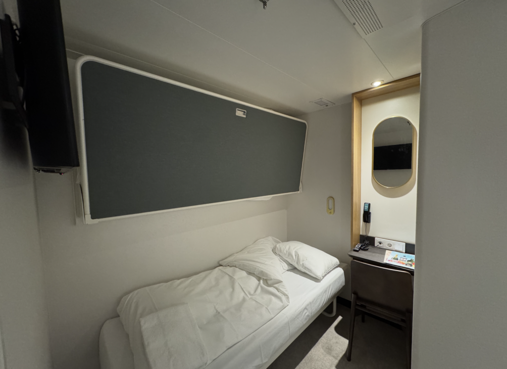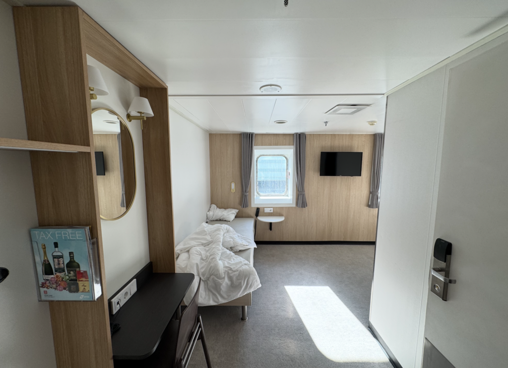 Vi boede i en standard indvendig kahyt. Det første, man lægger mærke til, er den optimerede pladsudnyttelse, men dog fortsat ikke god mulighed for at opbevare sin bagage (eller have den åben). Så hold din store kuffert hjemme og rejs let.