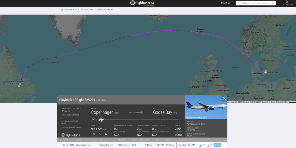 SAS måtte endnu en gang håndtere en uventet situation, da en af selskabets Airbus A330-fly (LN-RKM) måtte foretage en sikkerhedslanding i Goose Bay, Canada. Denne gang kom SAS dog hurtigt i aktion: Et erstatningsfly – også en Airbus A330 (SE-REH) – blev straks afsendt for at hente passagererne hjem, og flyvningen forventes at lette fra Goose Bay omkring 16:00 lokal tid i dag.