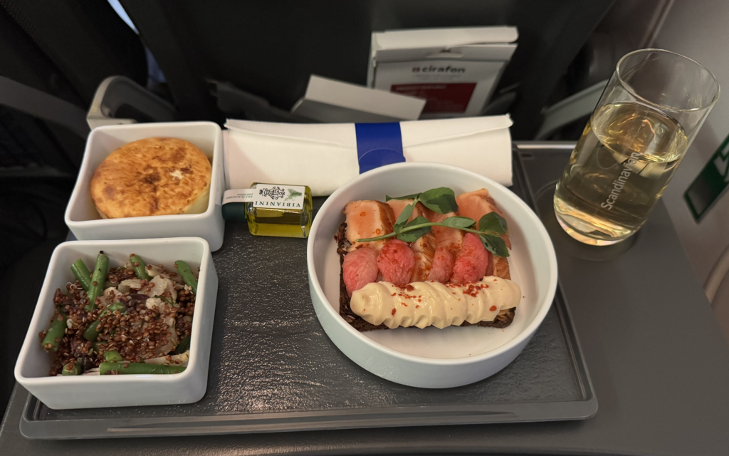 Til lejligheden var hele kabinen konfigureret som EuroBusiness med blokerede midtersæder, og alle passagerer fik serveret business class-måltid.
